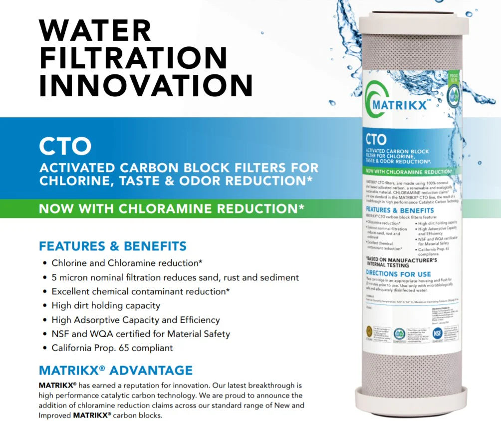 MATRIKX CTO filters are made using 100% coconut shell based activated carbon, a renewable and ecologically sustainable material. PFAS and chloramine reduction claims* are now standard in the MATRIKX CTO line, the result of a breakthrough and high-performance catalytic carbon technology.
