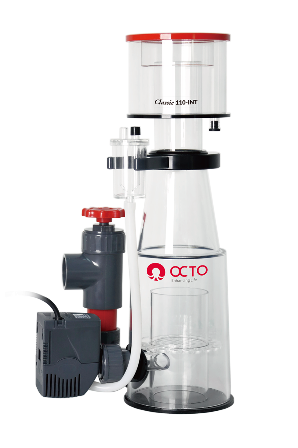 As with every Reef Octopus protein skimmer, the Classic 110INT (NWB-110) is constructed of high-quality cast acrylic and features an easy to adjust gate valve, a quick release neck for easy cup removal, cup drain, bubble diffuser, o-ring sealed union pump mount, air shredding Aquatrance 1000s pinwheel pump and air silencer.