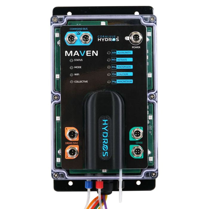 The HYDROS Maven is an advanced aquarium controller designed for saltwater aquariums that automatically tests the water parameters. This stand-alone device frees aquarists from the need to perform regular water testing, and performs the task with greater accuracy. It does not require another controller to function. With constant testing, the Maven greatly increases aquarium stability, and can be used to manage dynamic dosing schedules and other parameters with the HYDROS System. The HYDROS Maven can automatically test Alkalinity (dKH), Nitrate (NO3), Phosphate (PO4), Calcium (Ca), and Magnesium (Mg).