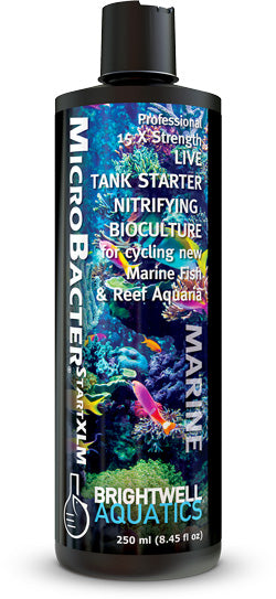 Professional 15x strength powerful live tank starter nitrifying bioculture, with much fewer temperature and shelf life restrictions than competing products, for rapidly cycling new marine fish and reef aquaria and brackish aquariums, and for recovering from overcrowding or disasters where the bacteria bed has been damaged or when adding new fish. It is also quite useful after re-arranging decorations or performing major maintenance, such as cleaning substrates or biological media to "recharge" the nitrifying bacteria population.